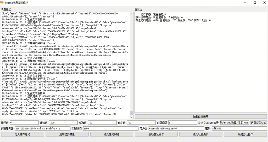 针对企业引流的核心需求,微软Teams协议群发软件集成了多项自动化功能:首先是自动批量登录CK号,支持多账号同时在线,无需人工重复操作,单账号登录成本低至0.02元,大幅降低人力与时间成本;其次,通过自动化筛选活跃的Teams手机号码用户,软件能从海量用户中精准定位高价值潜在客户,避免无效触达;配合批量私信群发功能,可一键向筛选后的用户发送定制化内容,结合自动化批量拉群功能,快速将意向客户集中管理,形成私域流量池。