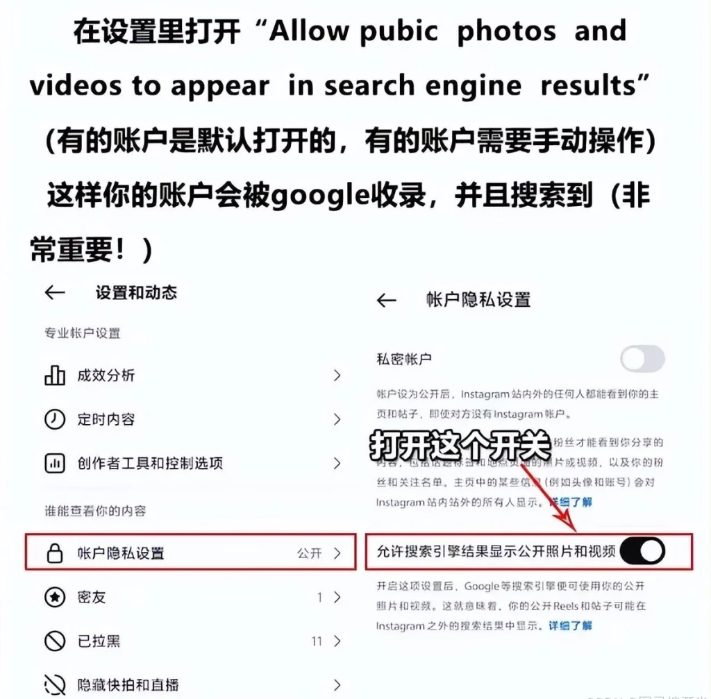 在设置里打开”Allow pubic photos and videos to appear in search engine results”(有的账户是默认打开的,有的账户需要手动操作)这样你的账户会被google收录,并且搜索到(非常重要!)