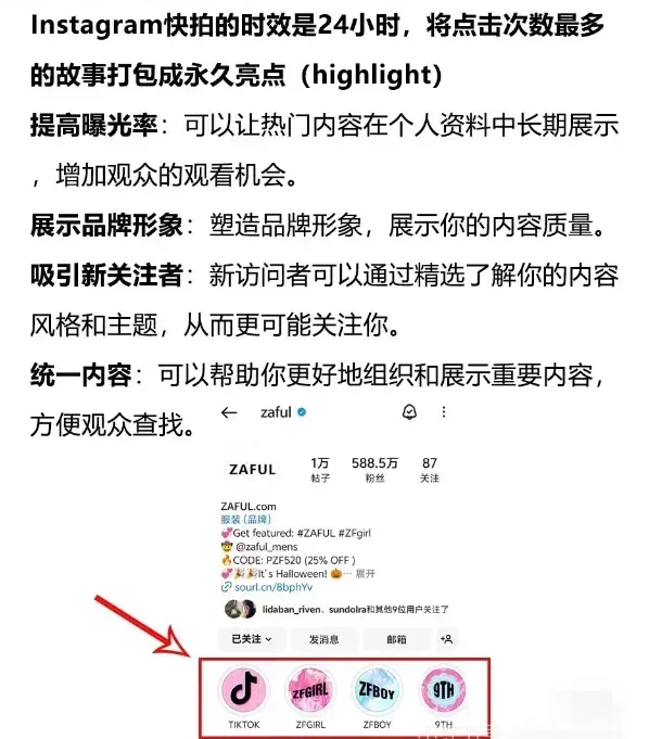 Instagram快拍的时效是24小时,将点击次数最多的故事打包,成永久亮点(highlight)提高曝光率:可以让热门内容在个人资料中长期展示,增加观众的观看机会。